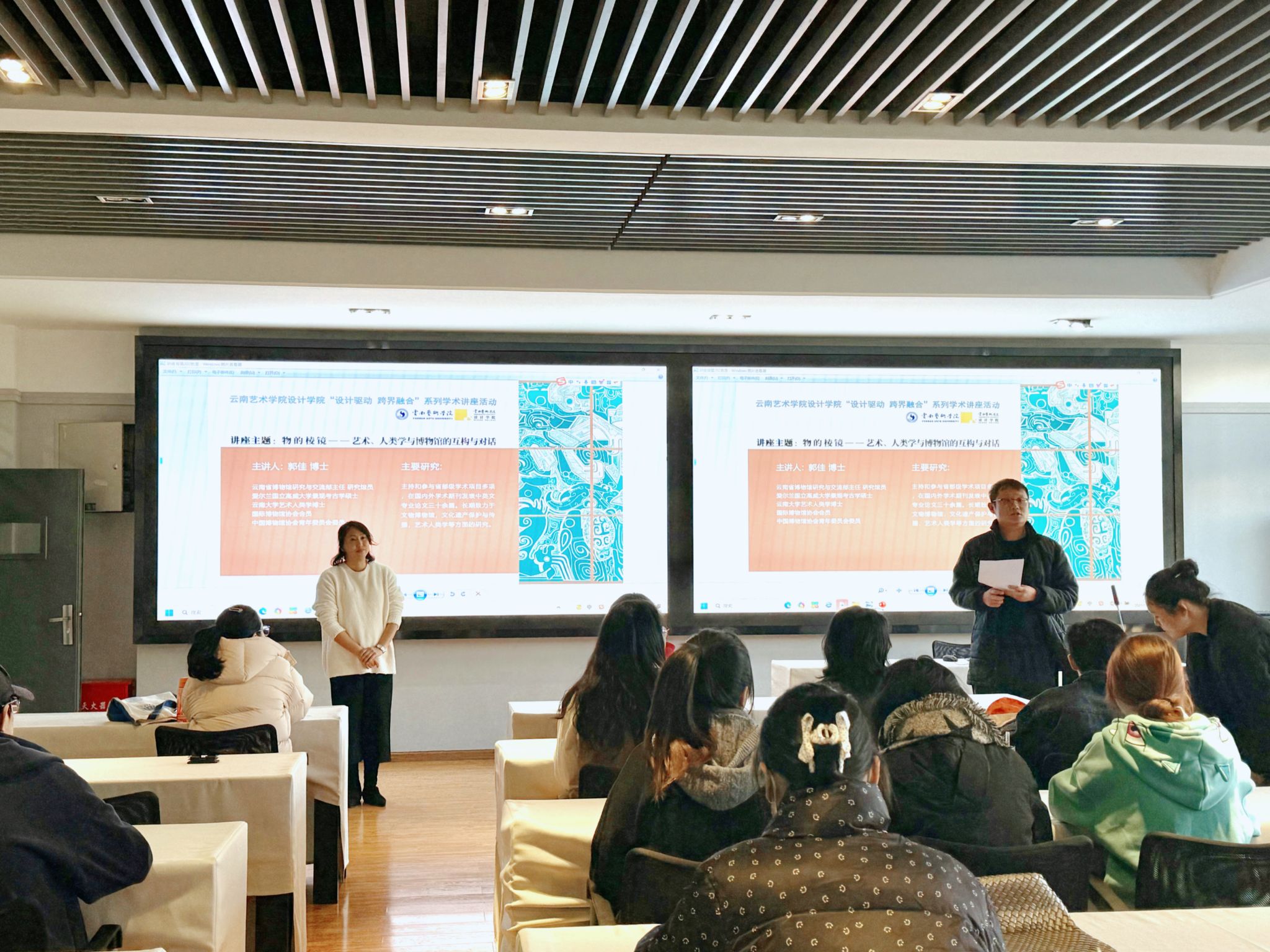 2025年12月9日,紧扣“设计驱动 跨界融合”系列学术讲座规划,深度契合设计学院“一站式”学生社区“学术融合、思维碰撞”建设工作要求,专题讲座《物的棱镜:艺术、人类学与博物馆的互构与对话》在设计学院202教室成功举办。本次讲座特邀云南省博物馆研究与交流部主任、研究馆员郭佳博士主讲。郭佳博士兼具爱尔兰国立高威大学景观考古学硕士与云南大学艺术人类学背景,学术底蕴深厚,视野多元开阔。设计学院研究生和科研管理科副科长杨艾伦主持活动,各专业研究生踊跃参与,共同探寻艺术、人类学与博物馆跨界融合的深层逻辑与实践路径。