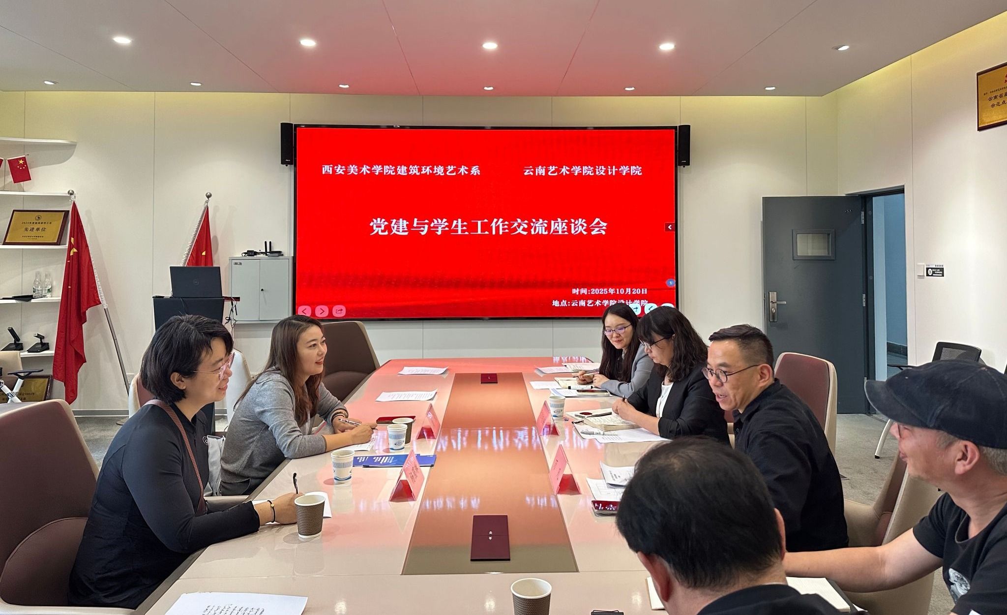 为深入学习贯彻习近平总书记关于党的建设的重要思想,积极推动构建“党建引领、理论铸魂、艺术赋能”工作格局,深化校际党建交流,以党建引领推动学科专业协同发展,共谋党建融合发展新途径,推动形成资源共享、优势互补的新局面,创新完善“党建引领、资源共享、相融互促、品牌共创”党建联建的机制和路径。2025年10月20日下午,云南艺术学院设计学院党委与西安美术学院建筑环境艺术系党委书记刘荣一行,开展党建共建联建,活动由云南艺术学院设计学院党委副书记、纪委书记欧阳继梅主持,云南艺术学院设计学院院长万凡参加会议。